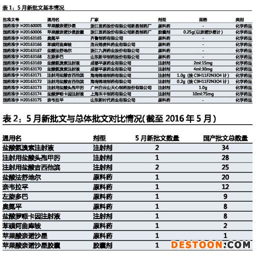 根據(jù)CFDA公布的信息,2016年5月批出13個(gè)新國(guó)產(chǎn)批文和1個(gè)新進(jìn)口批文。所有新批文全是化學(xué)藥品。按注冊(cè)分類統(tǒng)計(jì),13個(gè)國(guó)產(chǎn)批文中有2個(gè)批文是1.1類,其它批文全部都是6類。按劑型統(tǒng)計(jì)分析,只有1個(gè)口服劑型獲批,注射劑和原料藥各有6個(gè)批文。