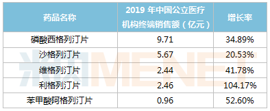 相比其它口服降糖藥,DPP-4抑制劑因口服吸收迅速、不易誘發(fā)低血糖和增加體重等優(yōu)點,得到市場的歡迎。米內(nèi)網(wǎng)數(shù)據(jù)顯示,2019年中國公立醫(yī)療機構終端5款DPP-4抑制劑銷售表現(xiàn)均不俗!利格列汀片以104.17%的銷售增長率領跑,磷酸西格列汀片年銷售額逼近10億元,苯甲酸阿格列汀片銷售額即將邁過億元大關。