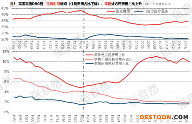 據(jù)美國經(jīng)驗,實施DRG后患者平均住院時間縮短、住院費用占比下降,相應(yīng)的零售處方藥費用占比上升(圖3)。