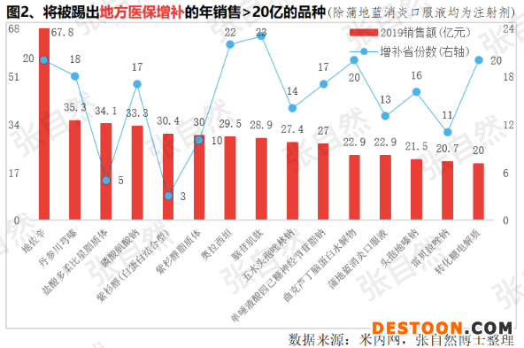 隨著2019年版國家醫(yī)保藥品目錄在各地的陸續(xù)實施,各省相繼調(diào)整省增補及重點監(jiān)控藥品,并按4:4:2的節(jié)奏分3年全部調(diào)出,今年6月底前先將國家重點監(jiān)控品種剔出,這將給行業(yè)帶來巨大影響,其中,年銷售大于20億元的品種就多達15個(圖2)。