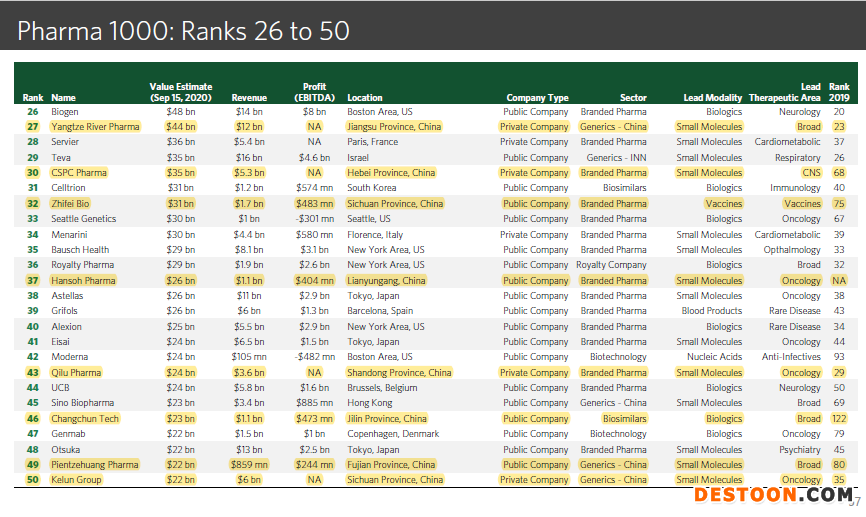 智飛生物以17億美元的年收入和310億美元市值,排名千強(qiáng)藥企第32位,較上一年上升75名。
