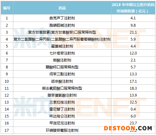 米內(nèi)網(wǎng)數(shù)據(jù)顯示,20個(gè)品種(23個(gè)品規(guī))2019年在中國(guó)城市公立醫(yī)院、縣級(jí)公立醫(yī)院、城市社區(qū)中心以及鄉(xiāng)鎮(zhèn)衛(wèi)生院(簡(jiǎn)稱(chēng)中國(guó)公立醫(yī)療機(jī)構(gòu))終端銷(xiāo)售額超過(guò)10億元的有16個(gè)。