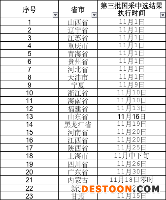 截至今日,據(jù)賽柏藍(lán)梳理,共23個(gè)省市明確了執(zhí)行第三批國采結(jié)果的時(shí)間,其中8省市均于11月1日起執(zhí)行,分別是遼寧、江蘇、山西、青海、貴州、重慶、河北、天津;另外15省市,寧夏、黑龍江、福建、河南、陜西、上海、海南、四川、江西、浙江、廣東、山東、內(nèi)蒙古、新疆、甘肅均于11月中下旬執(zhí)行第三批國采中選結(jié)果——其中,最晚的是廣東,開始執(zhí)行第三批國采結(jié)果的時(shí)間為11月30日。