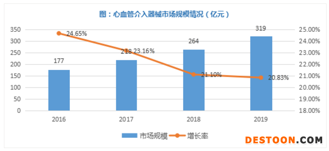 隨著心血管患者對介入治療需求的增加,心血管介入領(lǐng)域的器械市場迎來快速增長,據(jù)Eshare醫(yī)械匯測算,2019年心血管介入器械市場規(guī)模約為319億元。但受限于帶量采購、醫(yī)??刭M(fèi)等政策影響,心血管介入市場的增速將逐年趨緩。