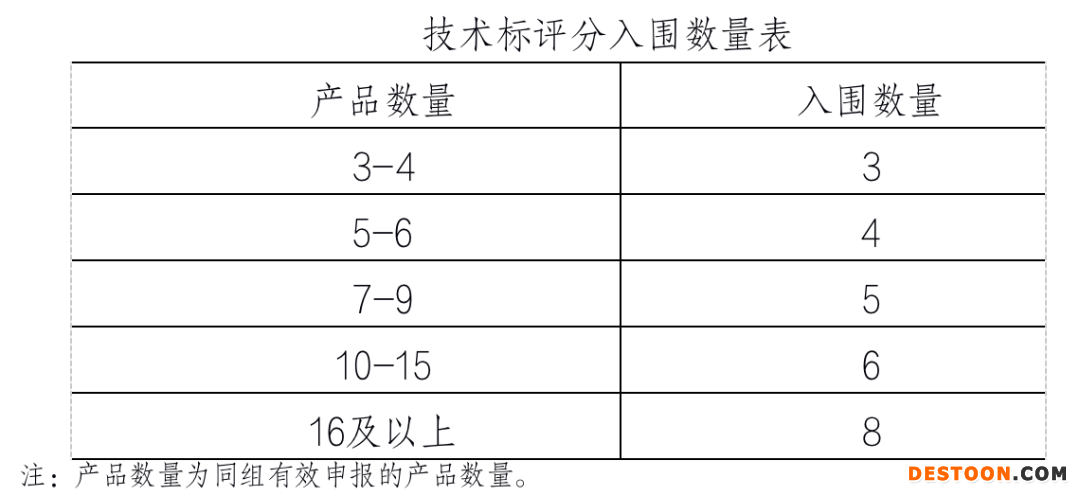 同一目錄,申報(bào)企業(yè)數(shù)量大于或等于3家的,將“技術(shù)標(biāo)評(píng)分”得分由高到低排序,按照“技術(shù)標(biāo)評(píng)分入圍數(shù)量表”的相應(yīng)數(shù)量,依次確定進(jìn)入綜合評(píng)分環(huán)節(jié)的產(chǎn)品(若最后一名得分相同時(shí),均進(jìn)入綜合評(píng)審環(huán)節(jié))。