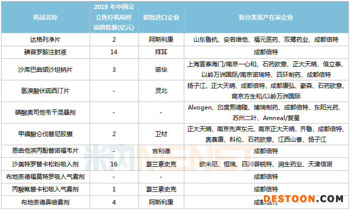碘普羅胺注射液、恩曲他濱丙酚替諾福韋片、布地奈德福莫特羅吸入氣霧劑、丙酸氟替卡松吸入氣霧劑、布地奈德鼻噴霧劑5個(gè)品種由成都倍特獨(dú)家以新分類報(bào)產(chǎn),其中拜耳的碘普羅胺注射液在2019年中國公立醫(yī)療機(jī)構(gòu)終端的銷售額超過10億元。